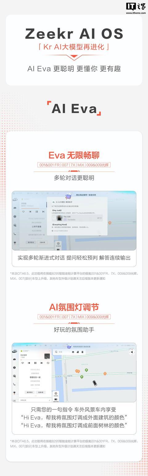 智能座舱交互方面,极氪的AI Eva也带来了多项新体验。Eva无线畅聊功能实现了多轮渐进式对话,能够轻松预判用户提问并连续输出解答。AI氛围灯调节功能让用户只需一句话,就能将车外风景带入车内。个性化迎宾功能则结合车内温度、节日和车内人数等信息,自动生成个性化的迎宾问候语,增强了用车的仪式感。Eva Family新增了多套装扮和道具,为用户提供了更多个性化选择。AI守护功能中的智能停车守卫V1.0,能够识别车辆轻微剐蹭磕碰的场景,更好地守护车辆安全。